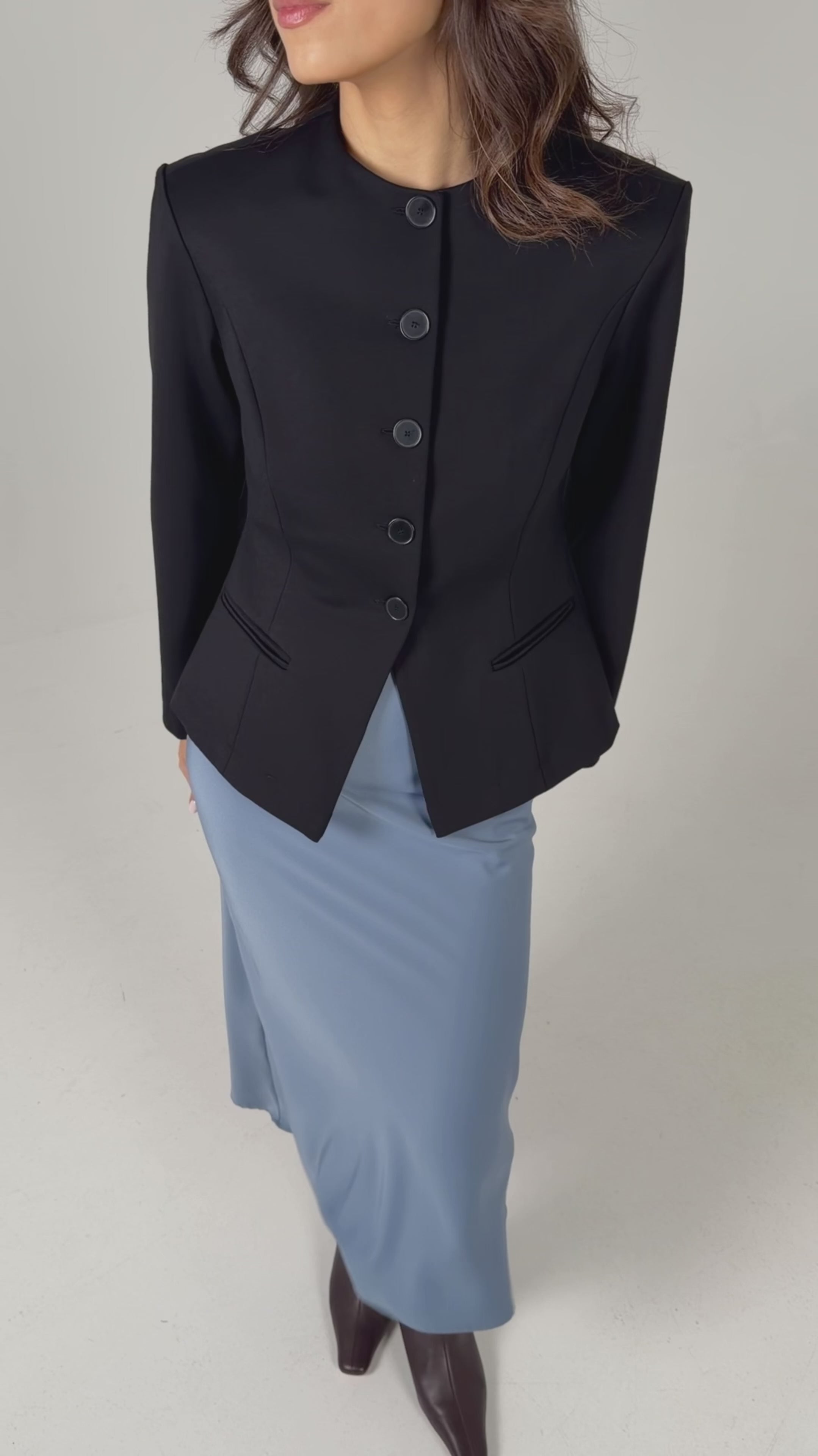 Harper is an extremely versatile jacket made of stiff, stretchy knitwear that allows you to move freely, but maintains a neat and elegant shape. The slightly shaped waist area and decorative pockets on the front create a beautiful figure shape, so the jacket is easy to combine for work, evening, and everyday style. Combine with trousers, jeans or a dress - this is a universal garment for various occasions.