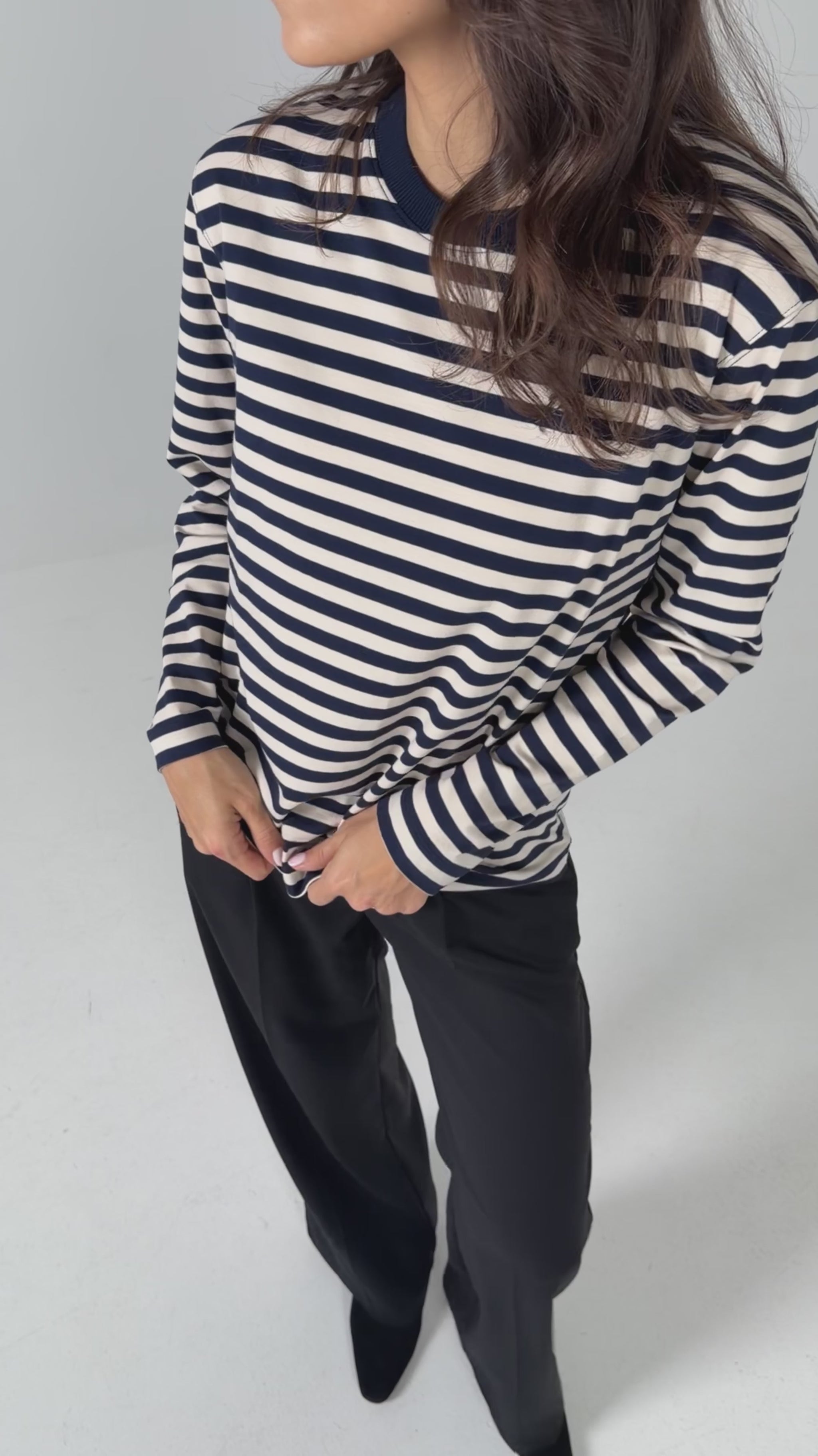 Minimalistiniai, bet išskirtiniai - dryžuoti marškinėliai ilgomis rankovėmis, sukurti kasdieniam dėvėjimui. Tamsiai mėlynos ir švelniai kreminės spalvų kombinacija suteikia subtilaus charakterio ir lengvai dera tiek prie džinsų, tiek prie laisvalaikio ar sportinio stiliaus aprangos. Išsiuvinėtas Atella inicialas.