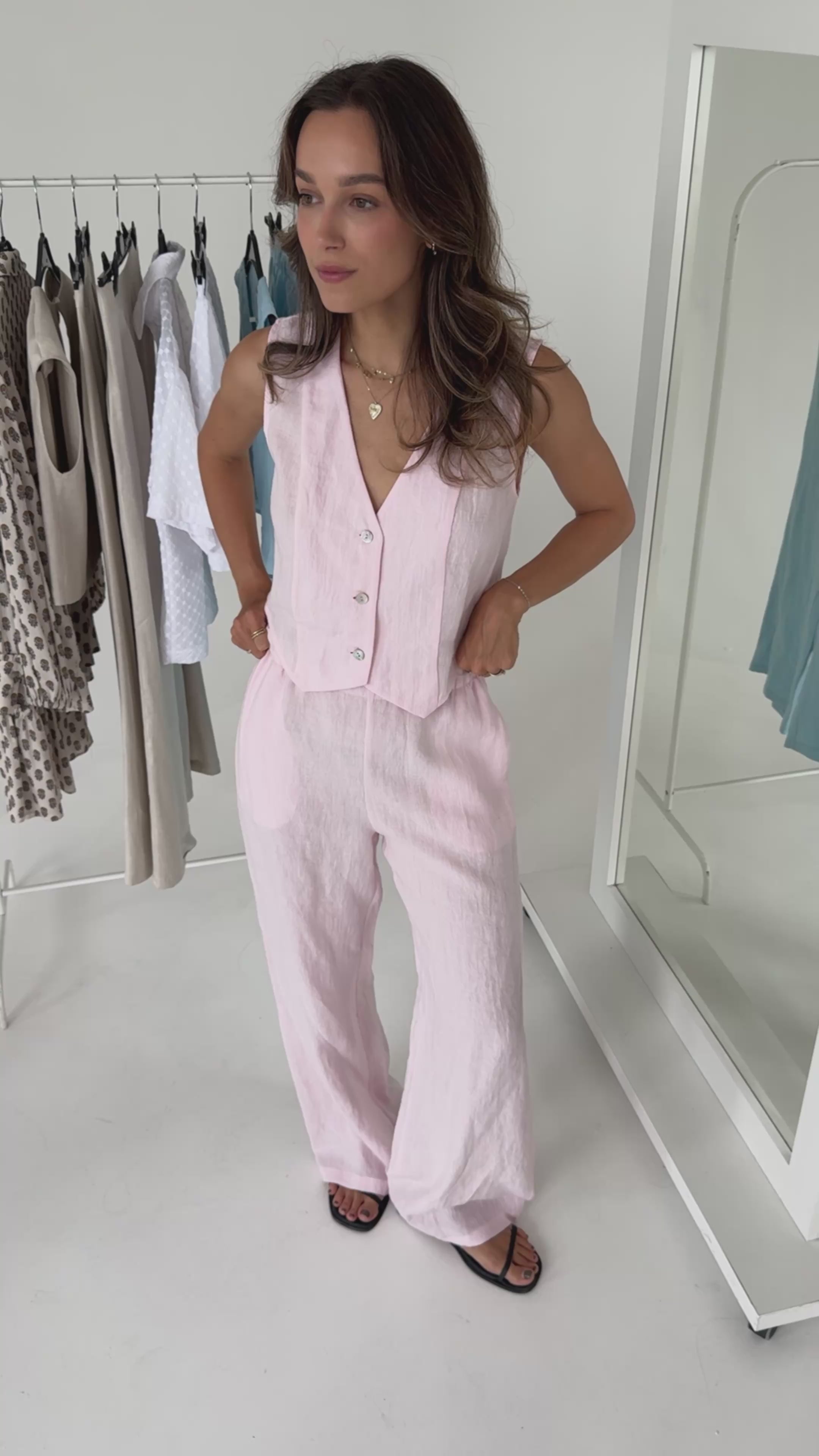 Rožinės spalvos, elegantiška liemenė Amira. Pagaminta iš 100% aukštos kokybės lino, ši liemenė užtikrina neprilygstamą komfortą ir kvėpuojančią tekstūrą, todėl yra nepakeičiamas drabužis šiltam orui. Linas natūraliai peršviečiamas šviesiose spalvose – rekomenduojame dėvėti su kūno spalvos apatiniais.